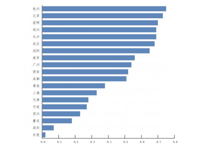 结果显示,即使是这些中国最具发展潜力的城市,医疗资源也存在明显的分布不均现象。医疗资源综合指数较高的城市,多数经济水平较高、人口数量相对较少。