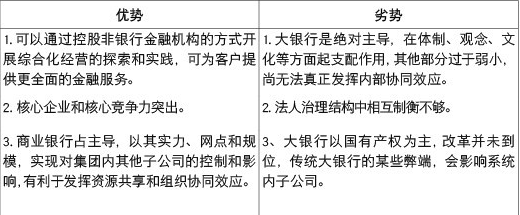 这类金控集团以“银行母公司+非银行子公司”模式来发展混业经营,有效规避了目前中国法律框架下对混业经营的禁止。大银行在境内外以合资或独资形式设立投资银行、保险公司、基金公司、信托公司、租赁公司、资产管理公司等非银行金融机构,并通过这些新设或控股独立的子公司来开展非自己主业的金融业务。可看作是外部全能化经营的一种形式(多个独立法人、跨行业经营、银行业为主、子公司业务围绕银行母体展开)。