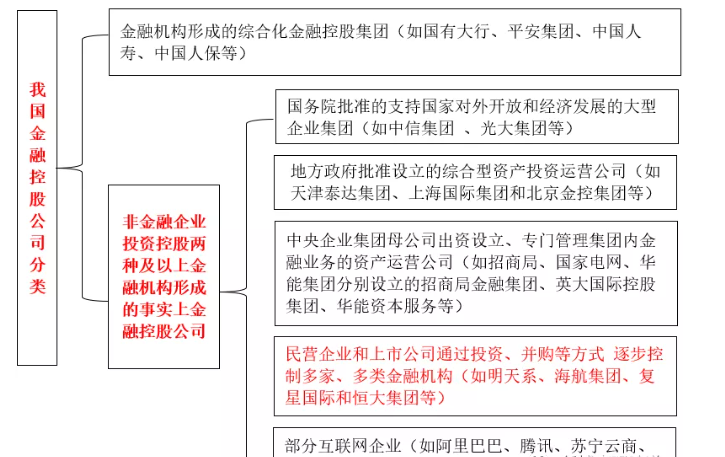 ⑵ 上述第二类金融控股集团还可以进一步分为四类,即国务院批准的金融控股集团、地方政府批准设立的金融控股集团、央企背景下的金融控股公司以及民企背景的金融控股集团、互联网企业背景的金融控股集团。