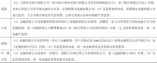 金融控股公司主要指对于两个或两个以上不同类型金融机构拥有实质控制权的机构,其中美国、日本和中国台湾地区的金融控股公司一般仅进行股权管理、所有金融业务都有子公司负责;英国和欧洲的金融控股公司除进行股权管理外,一般还会直接从事银行、证券、保险等具体金融业务。