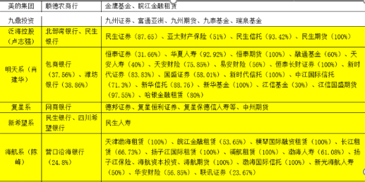 ⑴ 前三个系列相对比较稳固,第四个系列由于多为民营企业控股,变动相对较大,比较不稳定,受政策影响较为明显。例如,2004年的德隆系(已消失、未列),2006年的泰跃系,2013年的涌金系、2018年的安邦系(已变更为大家系)以及今年的明天系等等。