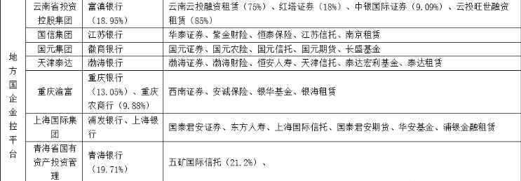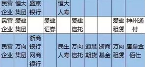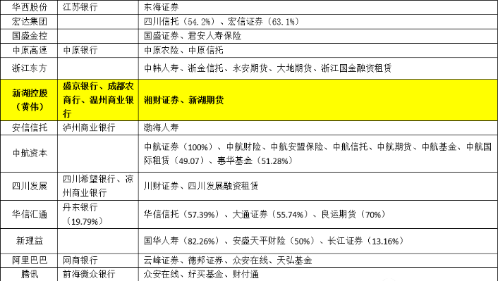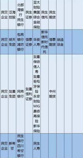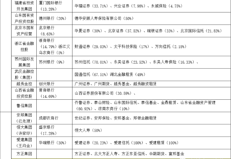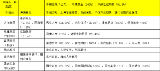 ⑵ 目前传出一些问题的民企控股集团主要包括新湖控股、恒大集团、海航集团、中国华信、中植集团等等。其中新湖控股拥有湘财证券(另外一个股东为国家电网)和新湖期货两张牌照,恒大集团拥有恒大人寿,海航集团通过海航资本和渤海金控拥有租赁、信托和保险牌照(其拥有的联讯证券比例较低),华信拥有券商、保险和期货牌照。中植集团最近的问题比较多,其持有的中融信托控股权已被经纬纺机获得。