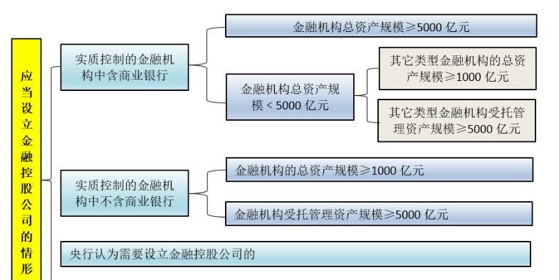 目前来看需要设立金融控股公司大致有四种情况,即实质控制的金融机构达到一定规模(两种情形)、央行根据宏观审慎监管要求认为需要设立、企业集团内金融资产占比达到85%及以上的企业集团。