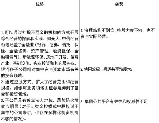 这类金控集团的特点是,专业性的子公司合并到一个控股公司下面来管理。金控公司自身一般不从事具体经营活动,主要负责战略规划、风险控制、财务审计、监督管理、交叉联动、服务保障和信息技术支持等职能。旗下金融业务功能齐全,结构相对均衡,但特色也各不相同。如光大、中信以商业银行为主,兼有证券、保险、期货,且有实业投资。平安作为中国市场化程度较高的金控集团,虽然已收购深发展银行以补齐银行短板,但短期内仍以保险为主导。银河作为国家实施救助的结果以原银河证券为主搭建,信达、华融等资产管理公司也在探索向此类金控集团转型。