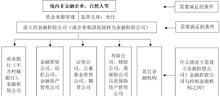 这里有两点需要注意,一是《金融控股公司监督管理试行办法》主要针对境内非金融企业、自然人等控股股东或实际控制人的金融控股公司,未包括金融机构跨业投资控股所形成的金融集团(会另行制定规则)。二是金融控股公司控制的金融机构主要包括六大类,即商业银行(不含村镇银行)、金融租赁公司;信托公司;金融资产管理公司;证券公司、公募基金管理公司、期货公司;寿险公司、财险公司、再保险公司以及保险资产管理公司;国务院金融管理部门认定的其他机构。