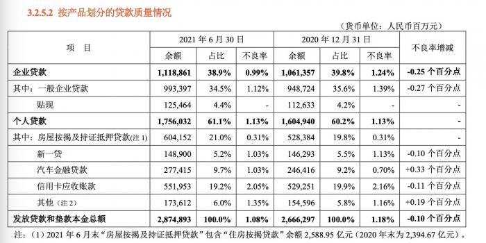 但从具体细分业务对应的不良贷款情况来看,企业贷款上半年不良率为0.99%,较上年末下降 0.25 个百分点。个人贷款上半年不良率为1.13%,与上年末持平。但零售贷款中的汽车金融贷款和“其他”贷款(包括个人经营性贷款、小额消费贷款和其他保证或质押类贷款等)不良率较上年末分别上升0.33个百分点和0.19个百分点,为1.03%和1.35%。