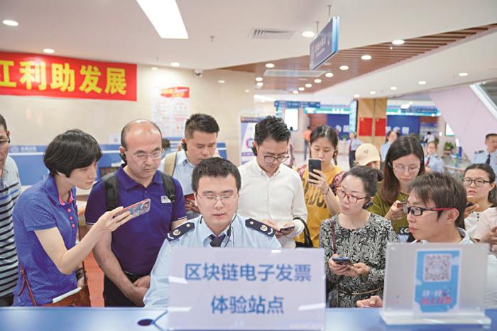 图为广州市白云区税务局辅导纳税人开具区块链电子发票