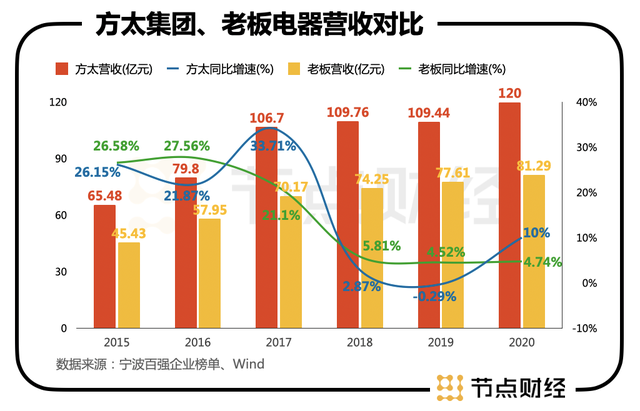 从历年宁波市制造业百强企业榜单公布的数据中,方太至少从2012年起,其营收规模26.7亿元,就已经在老板电器19.63亿元的营收规模之上了。2015年、2016年、2017年,二者的增速均保持在20%以上。