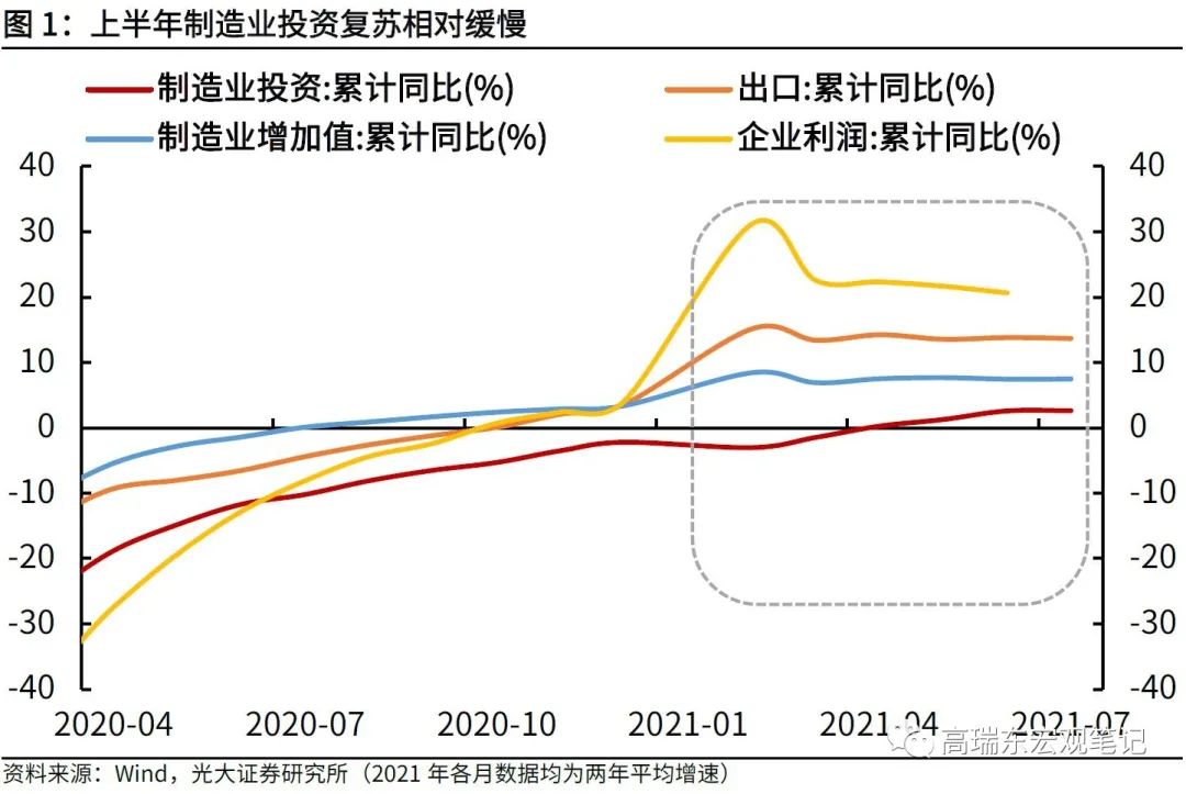 上半年,制造业投资恢复并不理想。虽然2021年6月的经济数据中制造业投资有所改善(7月受到极端天气与疫情影响,制造业投资增速有所回调),但是今年上半年1-5月的数据中,我们并没有看到制造业投资复苏转好的势头,2021年1-5月,制造业投资同比增长20.4%,两年平均增速仅为0.6%;今年的一季度,制造业投资同比增长29.8%,两年平均增速则为-2.0%。相比于其他经济指标,制造业复苏相对缓慢。