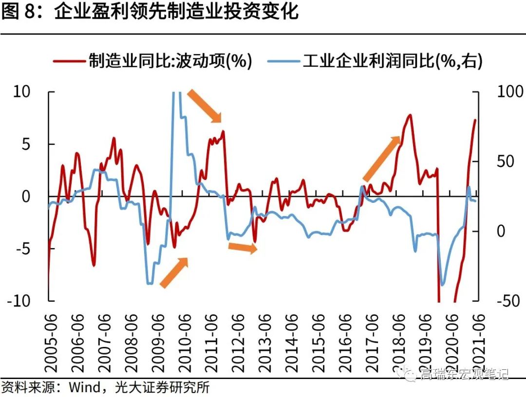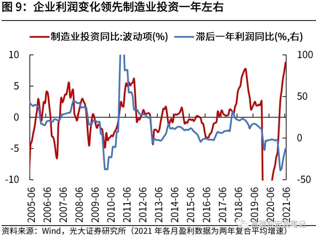 从历史趋势看,企业盈利变化也领先于制造业投资一年左右。盈利是制造业投资的领先指标,一般是企业进行资本开支的先决条件,决定企业资本开支的意愿和能力。从历史趋势看,工业企业盈利增速大约领先制造业投资12个月左右。