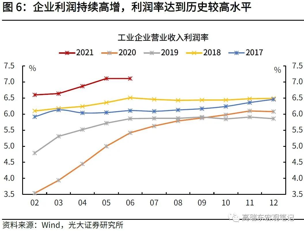 今年以来,企业盈利快速修复,2021年1-6月,规模以上工业企业利润同比增长66.9%,与2019年同期相比,利润增长45.5%,两年平均增长20.6%,基本延续了2020年下半年以来的较快增长态势。企业运营效率改善较快,利润率显著提升。2021年1-6月,规上工业企业营业收入利润率为7.11%,同比提高1.69个百分点,比2017-2019年同期均值提高0.95个百分点,利润率达到历史较高水平。