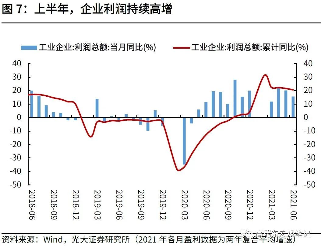 中上游来看,企业利润增速继续维持高位。受市场需求改善、大宗商品价格上涨等因素推动,上游采矿业和原材料制造业利润增长明显加快。2021年1-6月,采矿业利润同比增长133.0%,两年平均增长16.6%,相比1-5月继续加快;原材料制造业利润同比增长183%,两年平均增长35.8%,其中,黑色金属、有色金属冶炼和压延加工业、化学原料和化学制品制造业利润增长较快,两年平均分别增长41.2%、62.2%、37.0%,持续维持在高增区间。