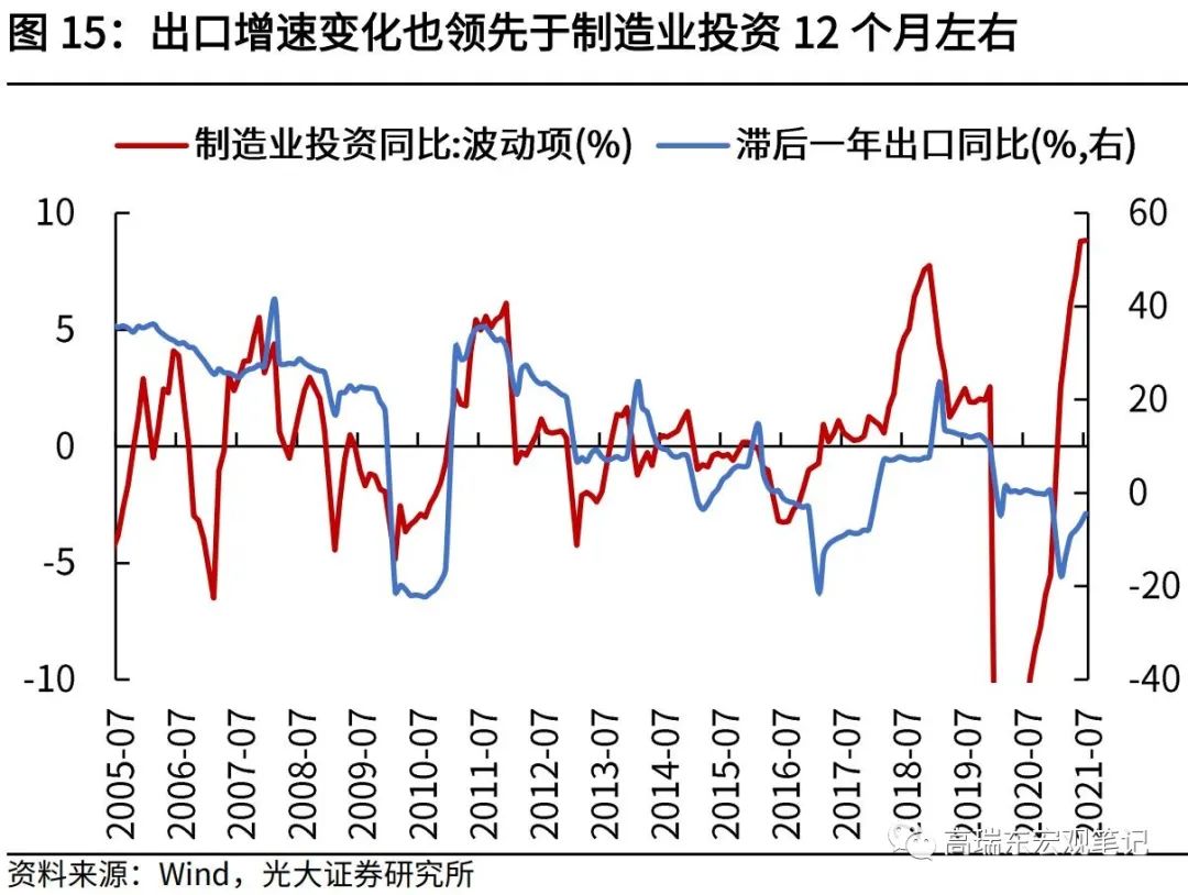 出口链与制造业链条联系较深,因而出口成为拉动制造业投资的主要驱动。出口链涉及行业全面且广泛,但参与其中的主要以装备制造业,服装、家具为代表的消费品制造业以及中间品制造业为主,出口链条与制造业链条的高度重合,使得出口成为制造业投资的重要推动力。另外,从历史趋势看,出口增速变化也基本领先于制造业投资增速一年左右。