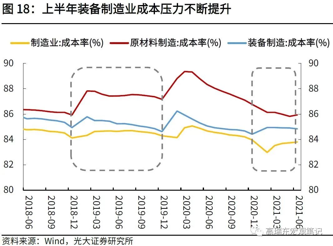 从成本费用来看,今年以来,下游制造业的成本费用压力不断提升。通过计算每百元营业收入中的成本占比来看,2021年1-6月,原材料制造业每百元营收中成本不断下降,而装备制造业每百元应收中成本则处于不断上升的趋势。从历史趋势来看,原材料制造业每百元营收中成本平均比装备制造业高2.3元,而2021年以来,二者差距缩小至1.0元,装备制造业成本压力不断加大。