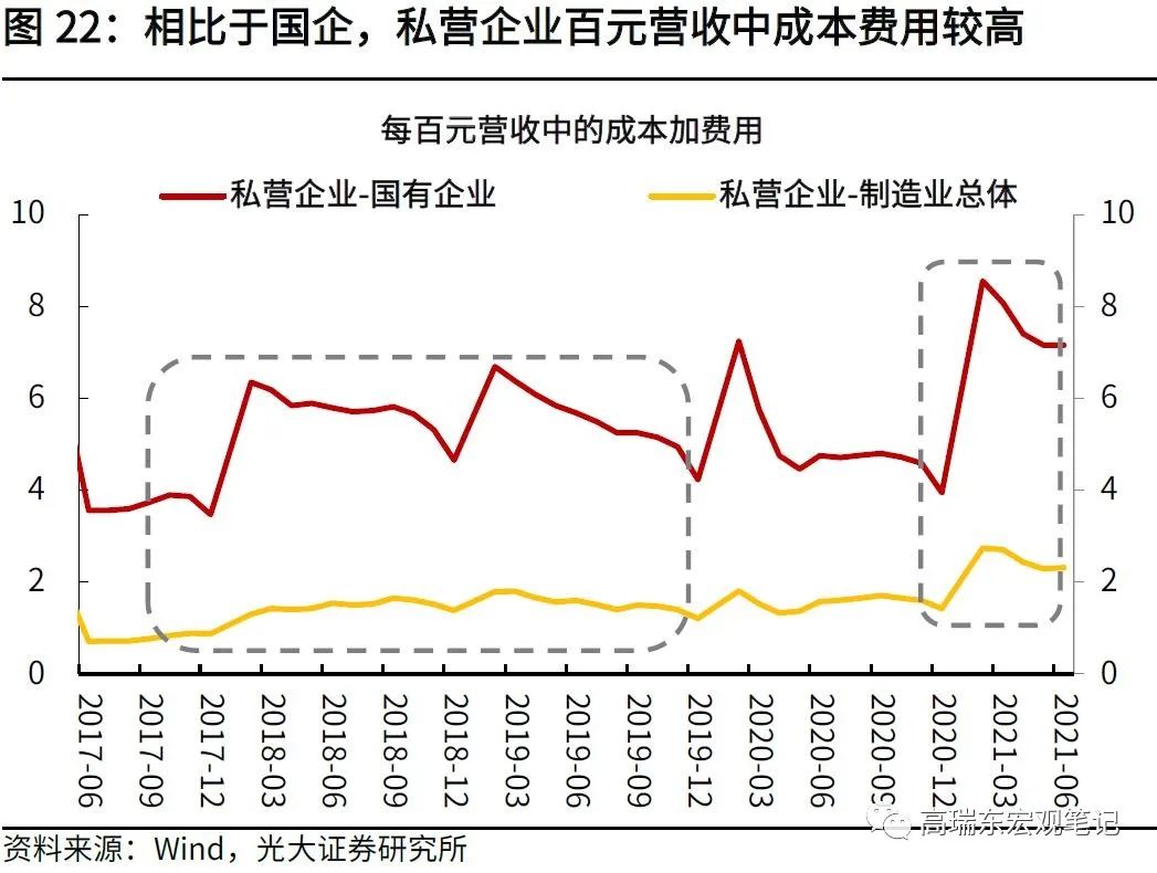 从成本费用来看,私营企业也承受了比国有企业更高的成本压力。我们统计了工业企业每百元营业收入中的成本和费用情况,从历史趋势看,私营企业一直以来面临更高的成本费用率,平均来看,2021年以前,私营企业每百元营业收入中的成本和费用比国企企业平均高5.15元,私营企业比制造业总体高1.43元。