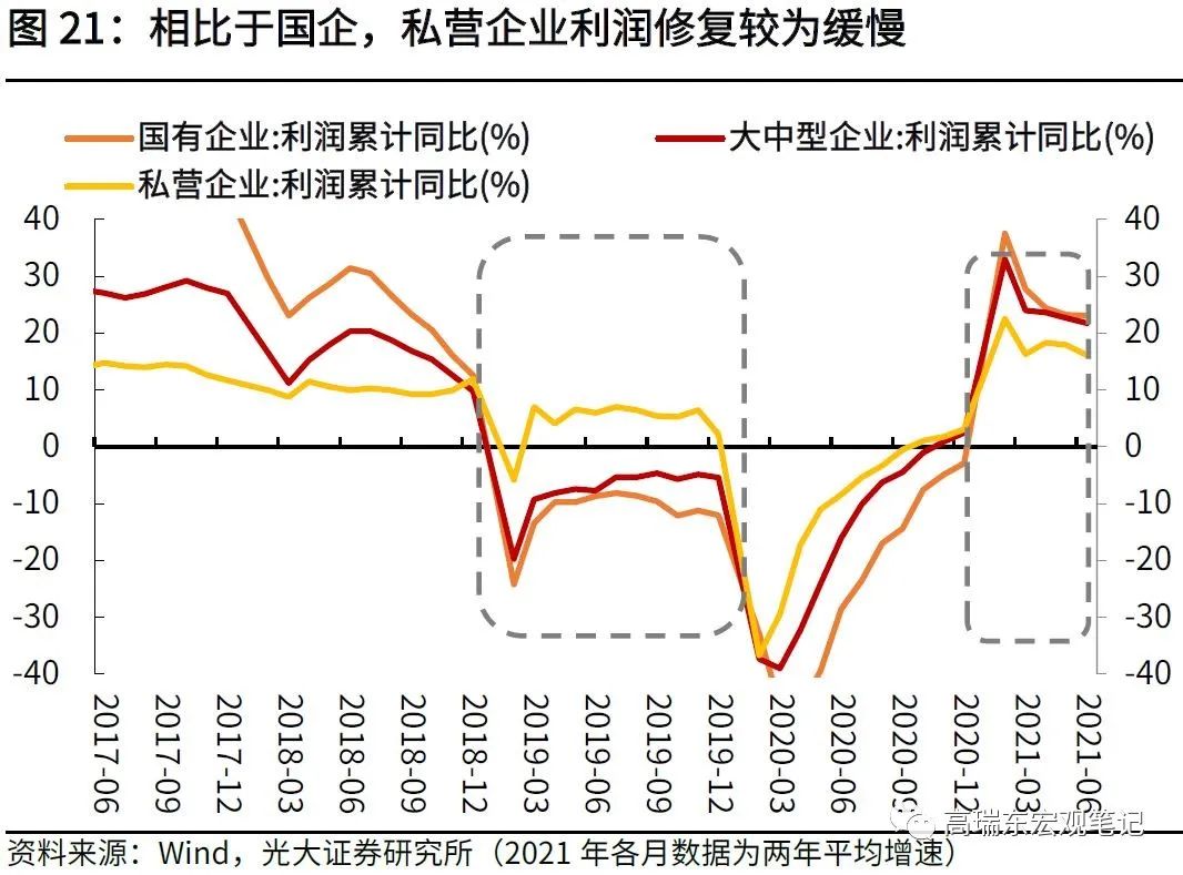 相比于国有企业,私营企业利润修复较为缓慢。2021年1-6月,制造业盈利整体处于较高增速区间,但内部分化明显。分不同所有制来看,国有企业与大中型企业盈利增速较快,上半年两年平均增速基本维持在20%以上的高增区间;私营企业盈利修复则相对较慢,2021年二季度的利润两年平均增速已处于下降趋势。