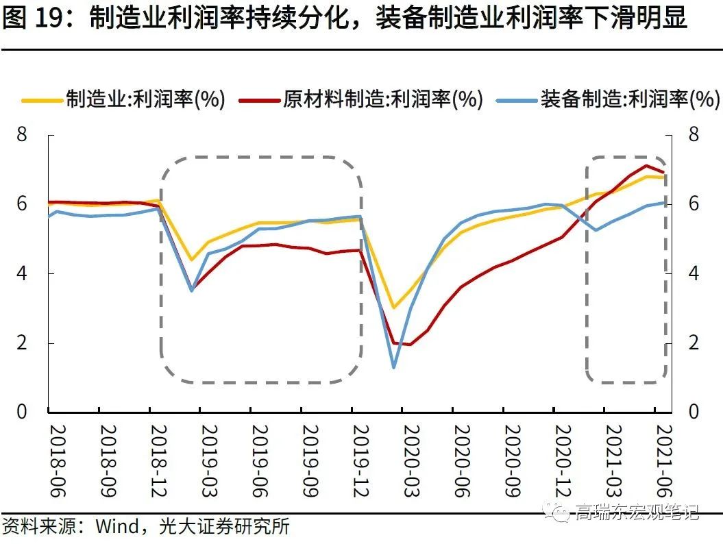 从利润率来看,装备制造业利润率持续低于原材料制造业。2021年1-6月,规上工业企业营业收入利润率为7.11%,与1-5月持平,同比提高1.69个百分点,比2017到2019年同期均值提高0.95个百分点。虽然利润率整体都在抬升,但是装备制造业利润率持续低于原材料制造业利润率,这与2021年之前趋势完全不同。