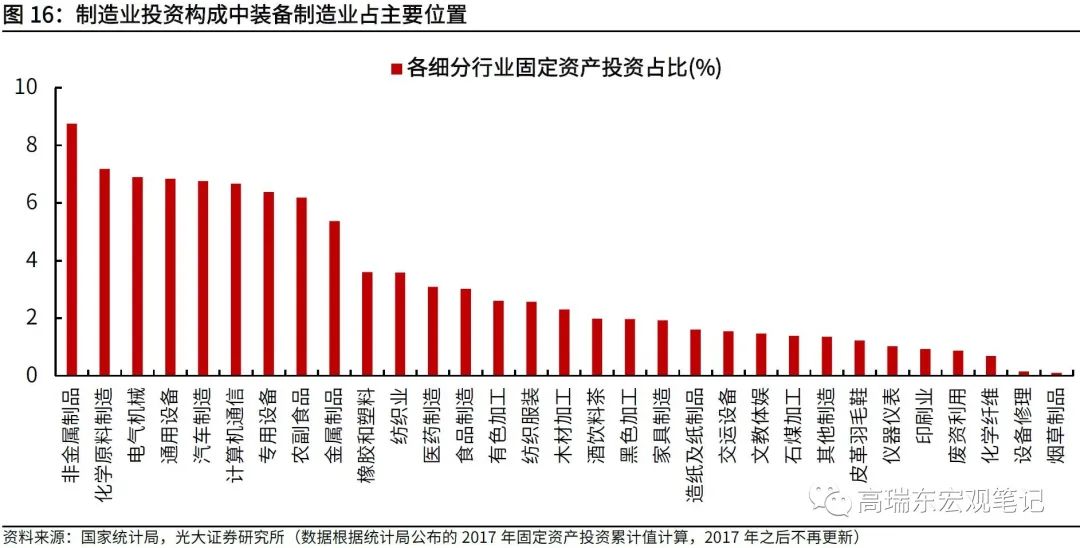 下游装备制造业是制造业投资的核心构成。我们计算了固定资产形成中装备制造业所占的比重,发现装备制造业的资本形成在所有制造业的资本形成中的比重超过40%,是制造业投资的核心组成部分。从统计局公布的2017年固定资产投资累计值来看,电气机械占比6.9%,通用设备占比6.8%,汽车制造占比6.8%,计算机电子占比6.7%,专用设备占6.4%,这五个行业的占比已高达33.5%。因而分析制造业投资的核心在于分析装备制造业。