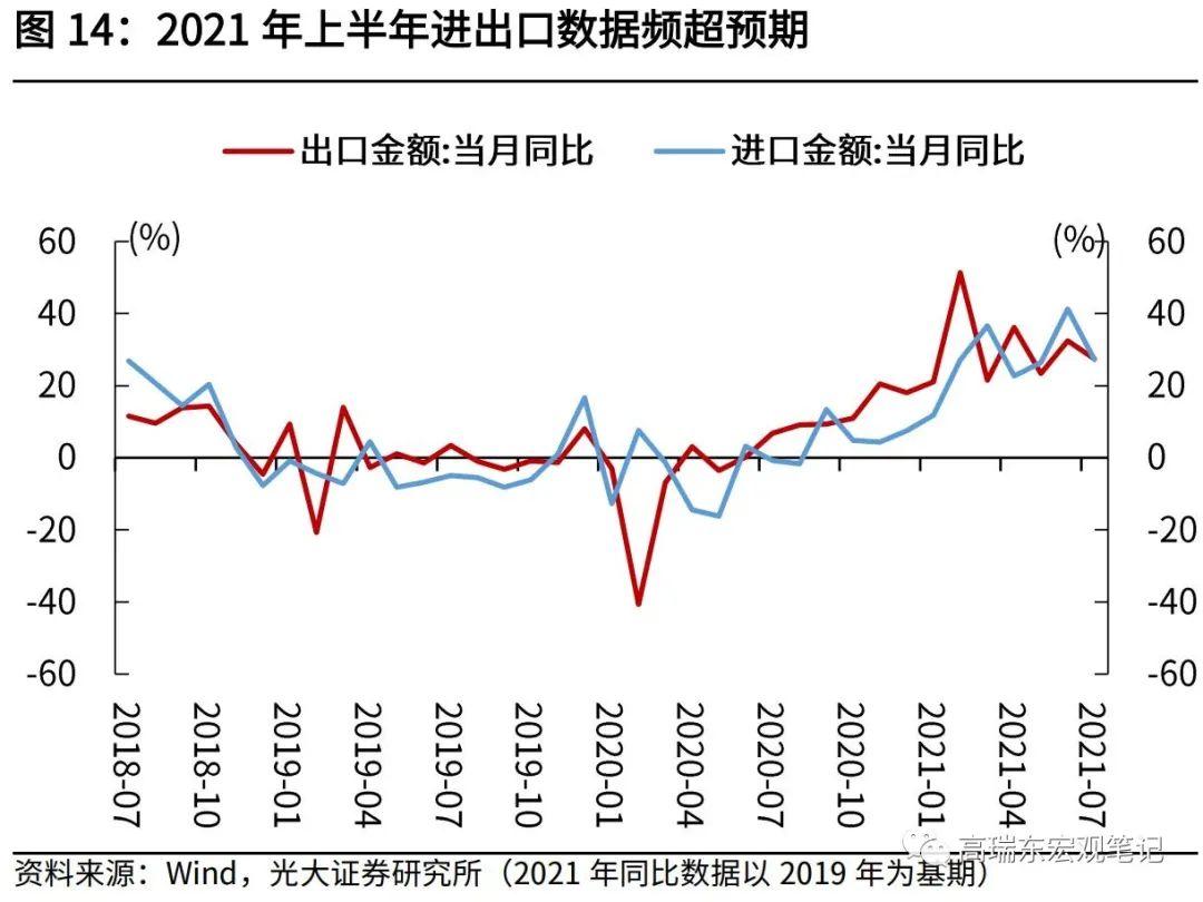 今年以来,出口表现亮眼,频超市场预期。今年上半年的出口韧性较强,防疫物资出口增速会随着全球疫情波动,非防疫物资出口则受到海外供需缺口和海外供应链复苏补库的双重支撑。向前看,三季度欧美经济加速修复,对于工业品的需求持续释放,出口将维持较强韧性。