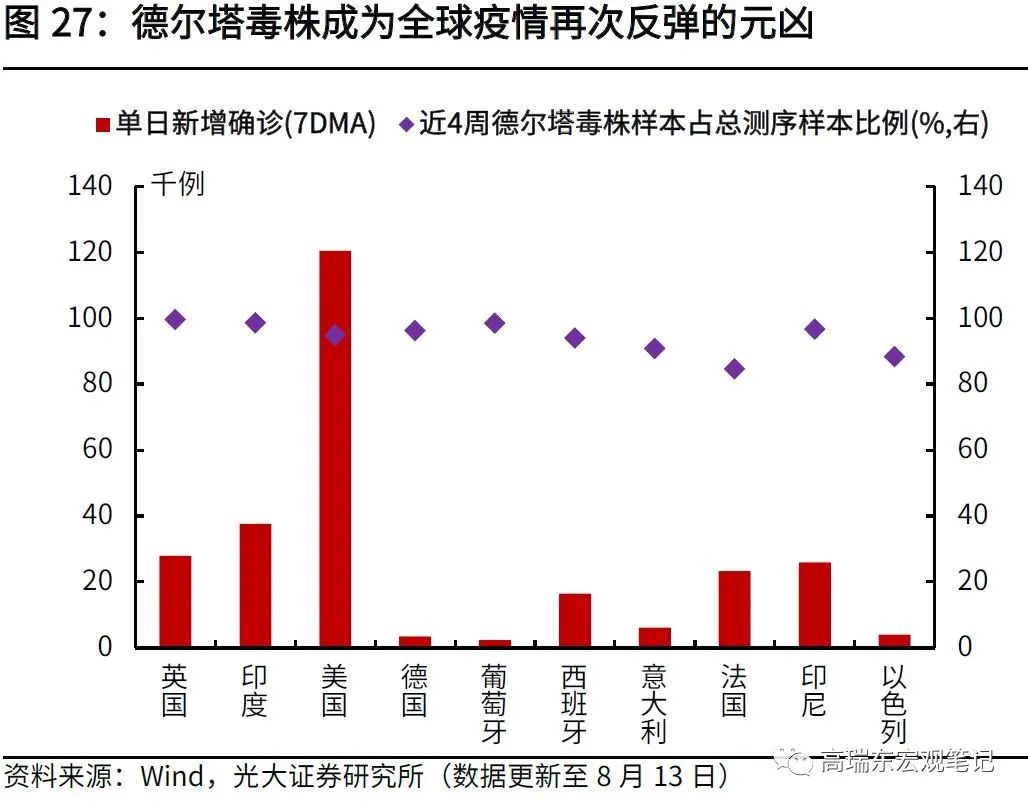 根据世界卫生组织数据,截至8月16日,“德尔塔”变异毒株已经传播至全球132个国家(含地区),仅次于今年2月份引起疫情大幅反弹的“阿尔法”变异毒株,传播力及传播速度较强。另一方面,根据全球共享流感数据倡议组织(GISAID)统计,截至8月13日,基于过去四周新冠肺炎新增感染病例样本,全球总递交检验序列中“德尔塔”变异毒株占比已至90%附近,疫情形势严峻。