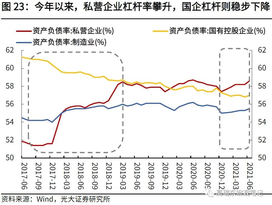 从杠杆率来看,上半年国有企业杠杆率处于稳定状态,而私营企业杠杆率则逐月攀升。2021年1-6月,制造业企业杠杆率基本处于小幅上升状态,资产负债率从2月份的55.1%小幅上升至6月份的55.5%,但区分不同所有制企业来看,杠杆率变化则有所分化。