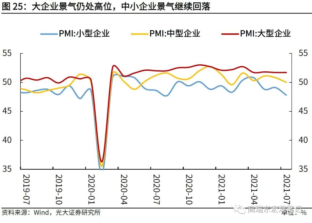 分大小企业来看,上半年大企业复苏明显好于中小企业。7月大型企业PMI为51.7%,与上月持平,高于制造业总体1.3个百分点。中、小型企业PMI分别为50.0%和47.8%,低于上月0.8和1.3个百分点。统计局指出,调查中部分中、小型企业反映,近期原材料成本上涨、订单减少、回款压力加大等问题突出,企业生产经营承压。