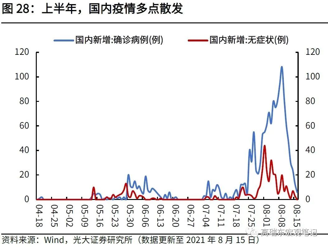 国内疫情也出现多点散发,并有所蔓延。上半年以来,国内疫情多点散发,广东、云南、辽宁、江苏等地均出现本土新冠疫情病例,近期在江苏发现的德尔塔毒株病例更是蔓延至国内多个省份。截至8月16日,国内本土现有确诊病例1185例,其中,江苏省扬州市现有确诊542例,江苏省南京市现有确诊183例,河南省郑州市现有确诊135例,湖南省张家界现有确诊70例,云南省德宏州现有确诊45例,湖北省荆门市现有确诊39例,湖北省武汉市现有确诊37例。本波国内疫情的扩散程度及持续时间,将会明显高于前几次散发疫情。本波国内疫情不同于前几次散发疫情,由于隐匿社区传播时间较长,变异毒株传播能力极强,且在引起全面防疫政策收紧之前,已经波及15省27市,溯源防控工作极其困难。