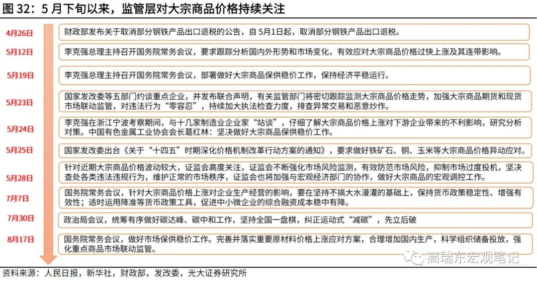7月政治局会议明确了碳达峰的工作态度和工作节奏,要先立后破,减少对经济以及价格的冲击。会议要求纠正运动式“减碳”,统筹有序做好碳达峰、碳中和工作,通过尽快出台2030年前碳达峰行动方案,来坚决遏制“两高”项目盲目发展,同时也做好大宗商品保供稳价工作。