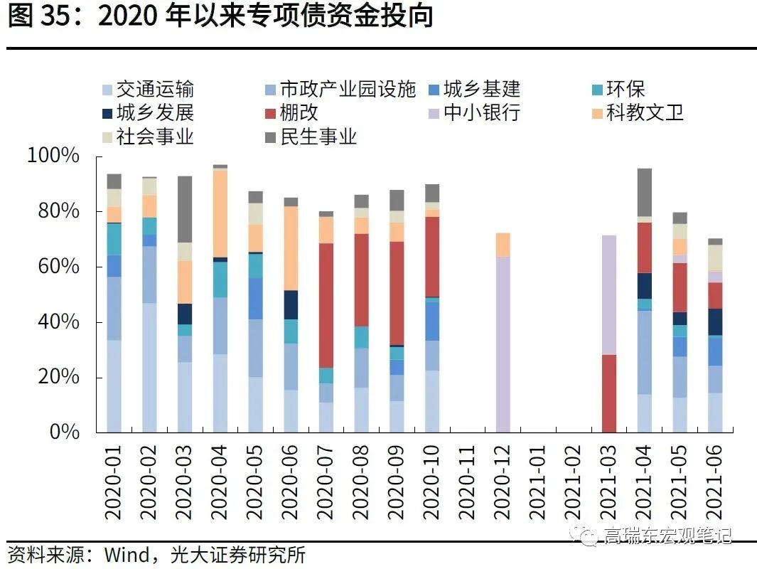 二是,专项债投向基建项目的比重明显高于去年下半年水平。今年上半年专项债中大约7成流向基建领域,明显高于去年下半年同期水平(不足50%)。随着“十四五”重大项目的陆续开工,也进一步支撑专项债流向基建领域。