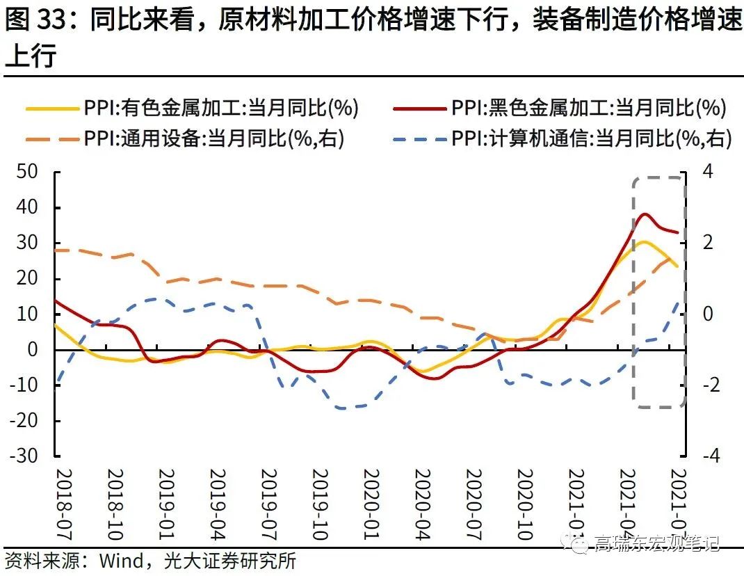 同时,装备制造业的价格正在向下游传导,成本压力或有所缓解。我们注意到,虽然大宗商品价格仍在高位震荡,但装备制造业的价格传导渠道已有所畅通。2021年5月,黑色加工、有色加工PPI同比分别增长38.1%、30.4%,6月二者同比增速分别下调为34.4%、27.8%,7月继续下调为33.0%、23.5%;5月通用设备、计算机电子PPI同比分别增长0.9%、-0.8%,6月上调为1.4%、-0.6%,7月继续上调为1.7%、0.3%。