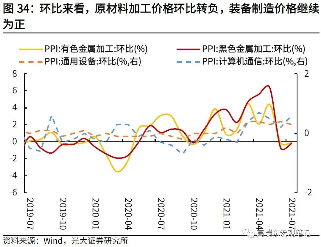 环比来看,6月黑色加工、有色加工价格环比转负,分别为-0.7%、-0.1%,7月继续维持负值;而6月、7月通用设备、计算机电子价格环比增幅持续为正,这说明了装备制造业的价格正在向下游传导,成本压力有望得到较大程度的缓解。