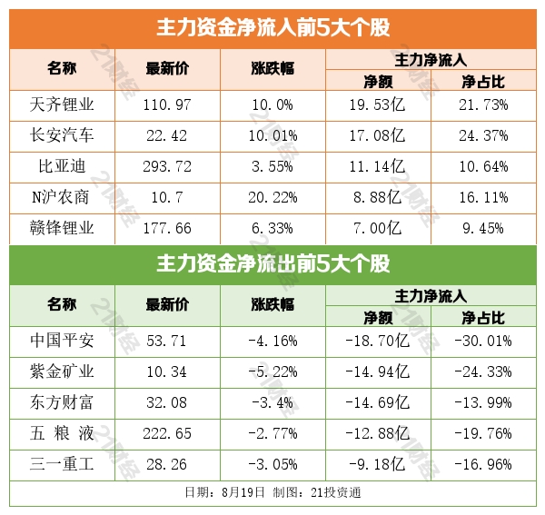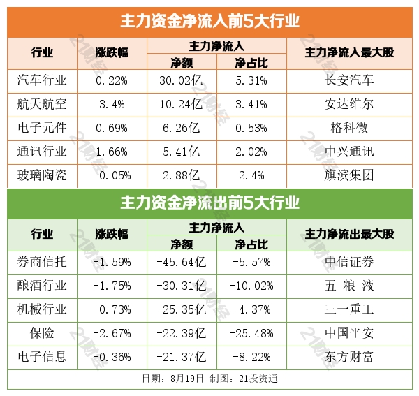 从净买入金额来看,8月19日,北向资金增持了16个行业,其中券商信托居首,净买入金额达8.29亿元。北向资金减持了43个行业,其中酿酒行业最多,净卖出金额达22.89亿元。