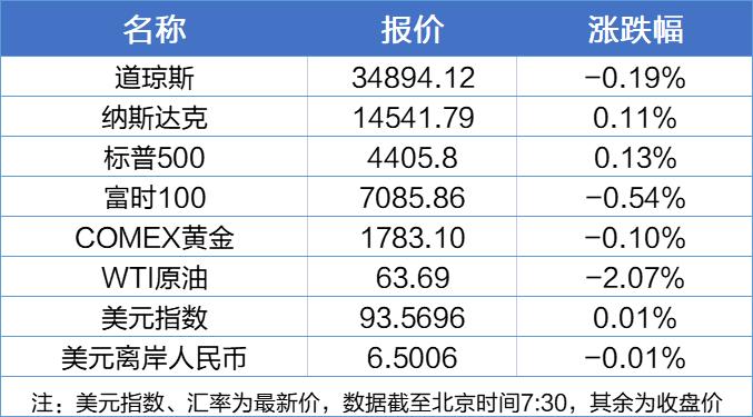 美股涨跌不一,道指跌0.19%,已连续三日下跌,纳指涨0.11%,标普涨0.13%;科技、日常消费品和医疗保健板块表现出色;热门中概股多数下跌,阿里巴巴跌近7%;国际油价跌超2%。
