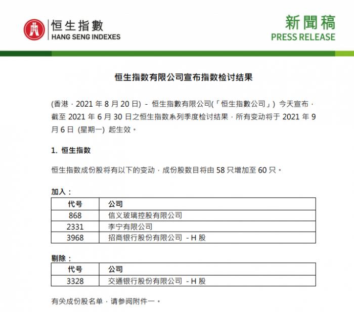 20日,恒生指数公司公布将李宁、招商银行、信义玻璃纳入恒生指数。