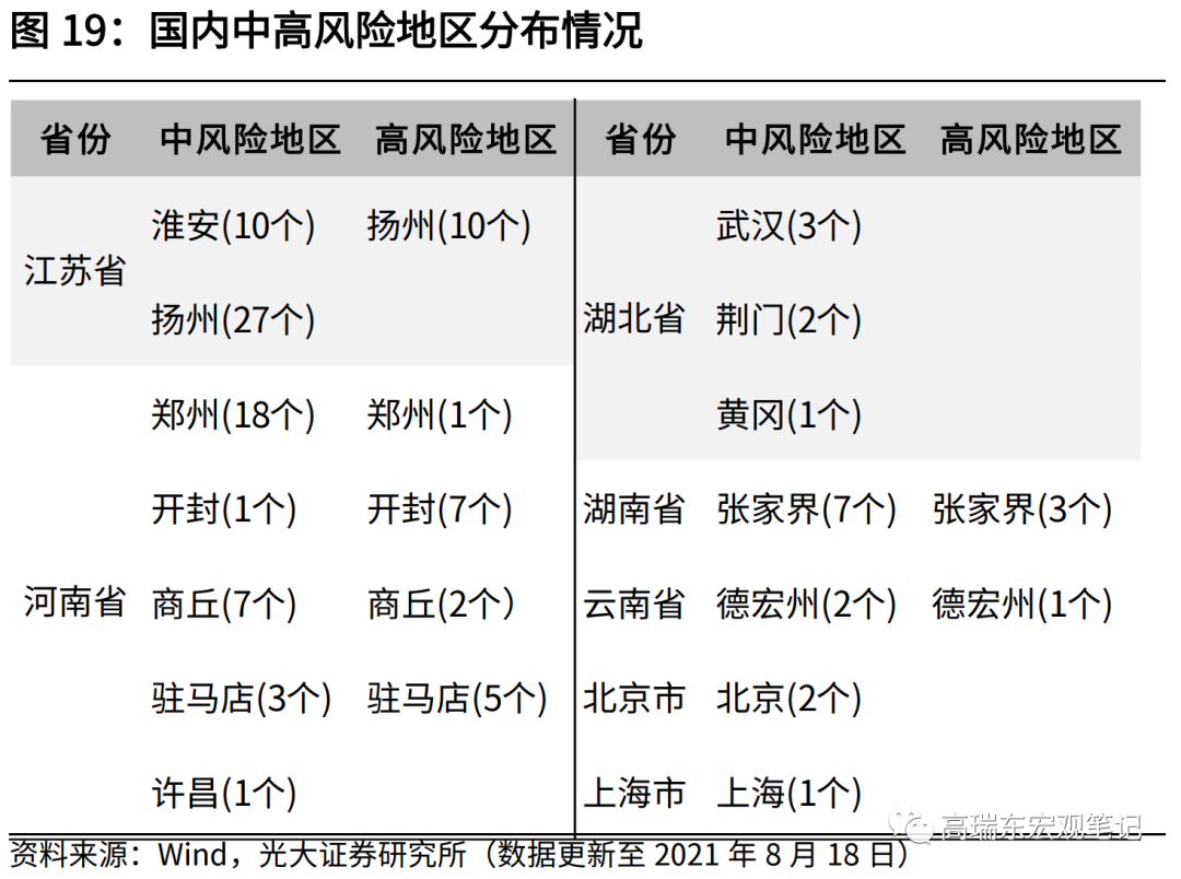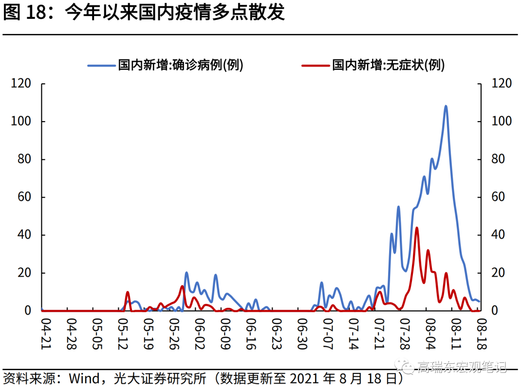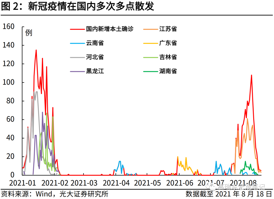 一则,国内疫情自年初以来呈现出多次多点散发态势。“德尔塔”变异毒株自6月份以来三次突破国内防疫屏障,第一次及第二次分别被控制在广东省及云南省,而第三次则由江苏省向全国扩散开来,目前虽已得到控制,但对实体经济已经产生明显影响,并且疫情持续散发对于政策及市场预期的影响有所加强。