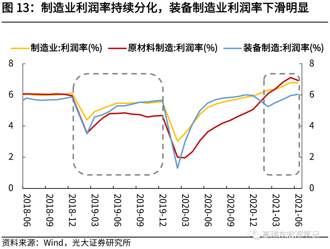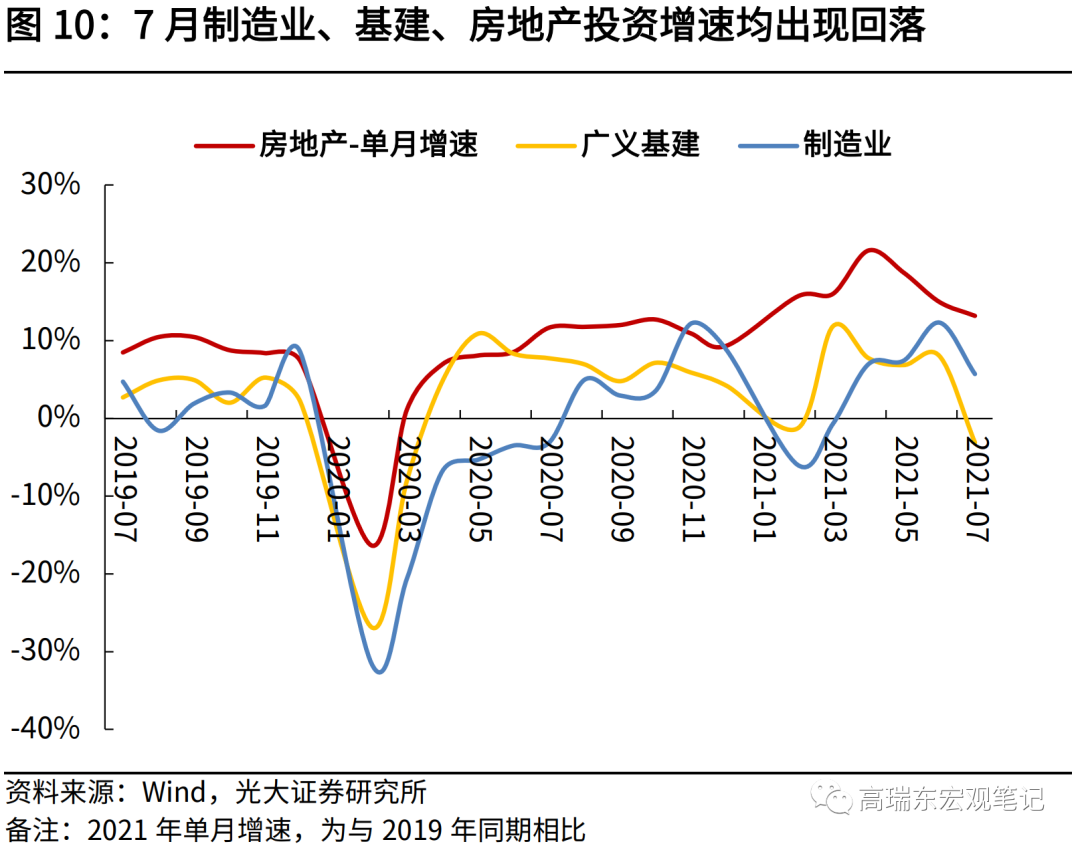 第一,制造业刚驶入弱复苏轨道,被7月疫情再次打断。今年以来,出口、企业盈利、信贷均保持较高景气,经济整体保持稳增长步伐。但是,上游涨价造成装备制造业盈利承压,企业恢复不均衡下私营企业复苏偏慢,以及疫情反复干扰下企业投资信心不足,三个因素拖累制造业投资复苏相对缓慢。(详见8月17日的报告《为何上半年制造业投资没有反弹?》)7月份,在疫情冲击下,制造业投资的弱复苏进程再次被打断,以2019年为基数,7月单月增速5.7%,大幅低于6月的12.3%及4月、5月(7%左右)。