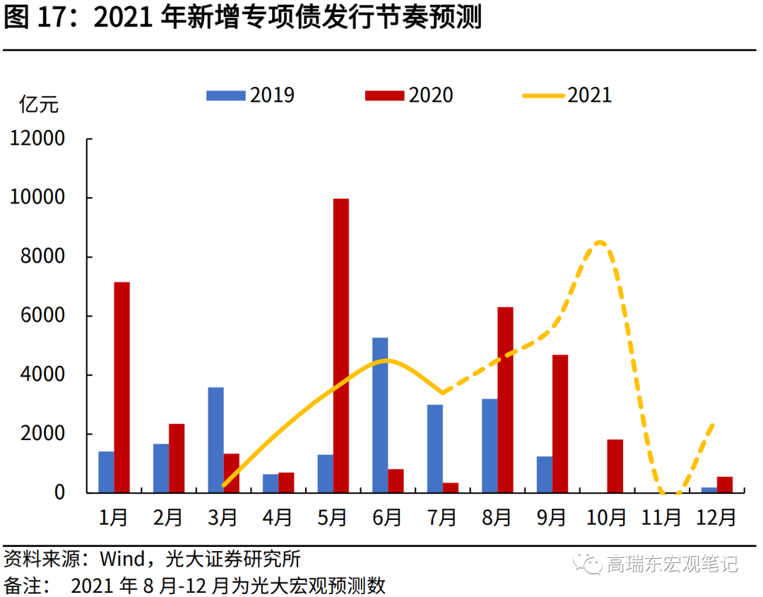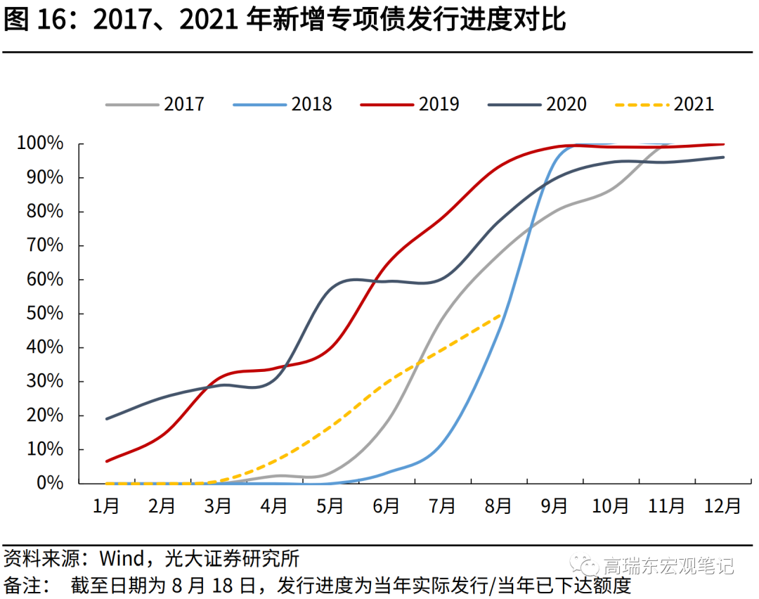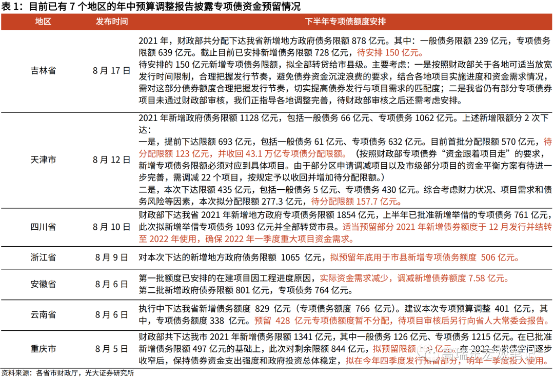 另一方面,部分省市已预留部分专项债额度至年底发行,将服务于明年一季度稳增长目标。根据7月30日政治局会议的指示,要统筹做好今明两年宏观政策衔接,这意味着专项债不仅要承担今年经济托底的任务,也要为明年一季度经济保驾护航。目前四川、重庆在预算调整报告中均明确表示,“预留部分2021年新增债券额度于12月发行,并结转至2022年使用,确保2022年一季度重大项目资金需求”。(详见7月31日的报告《财政平滑,货币放松,护航二十大——政治局会议学习体会》)