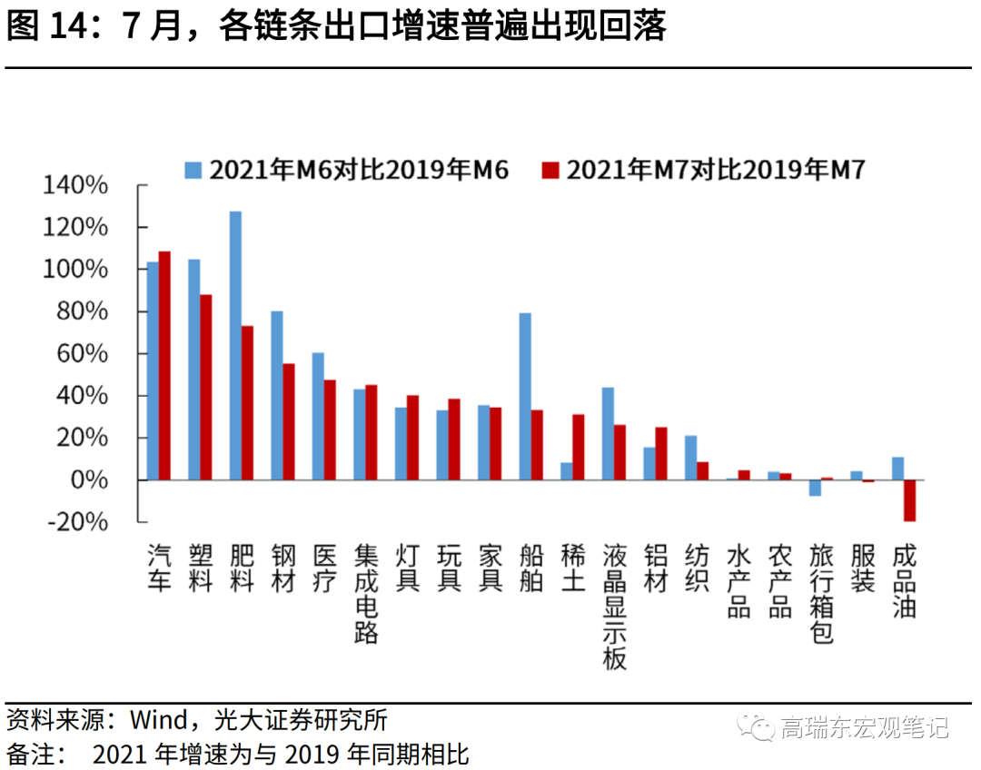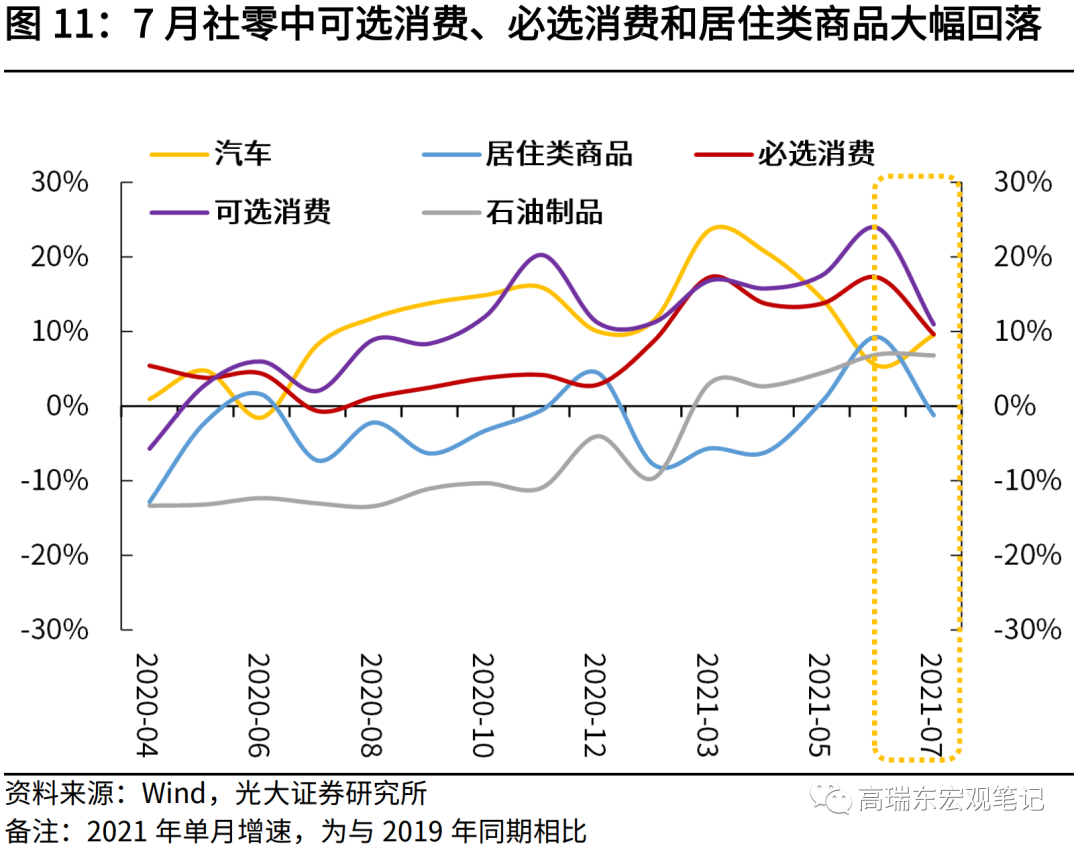 第二,消费方面,疫情防控工作约束居民活动半径,收入结构性分化,叠加居民预防性储蓄仍然较高,会继续抑制消费的复苏。与2019年同期相比,7月社零增速7.2%,低于3月至6月的表现(8.9%以上),略高于1-2月(6.4%)。向前看,限制消费恢复的因素,包括收入恢复的不均衡性,居民对于未来经济担忧而保持较高的储蓄率,都会因疫情反复而放大。
