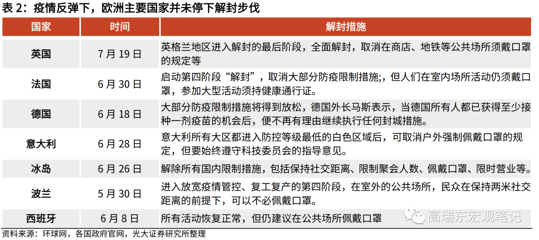 第二,欧美主要国家相继解封,国内面临开放国门的抉择。虽然近期欧美各国饱受“德尔塔”毒株的困扰,但是近期仍按照原先解封计划逐步放松疫情管控措施。美国方面,目前美国各州的限制措施均有所放松,大部分州已重新开放国内经济;英国方面,7月19日,英国首相宣布英格兰地区进入解封四步的最后一步,全面解封,并取消在商店、地铁等公共场所须戴口罩的规定。此外,法国、德国以及意大利地区也相继推进解封计划。此前6月26日,冰岛已宣布取消所有国内限制措施,恢复正常生活。