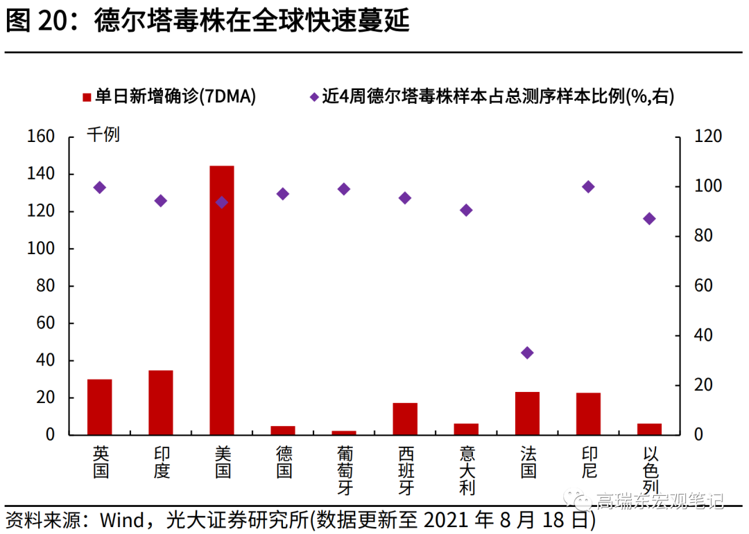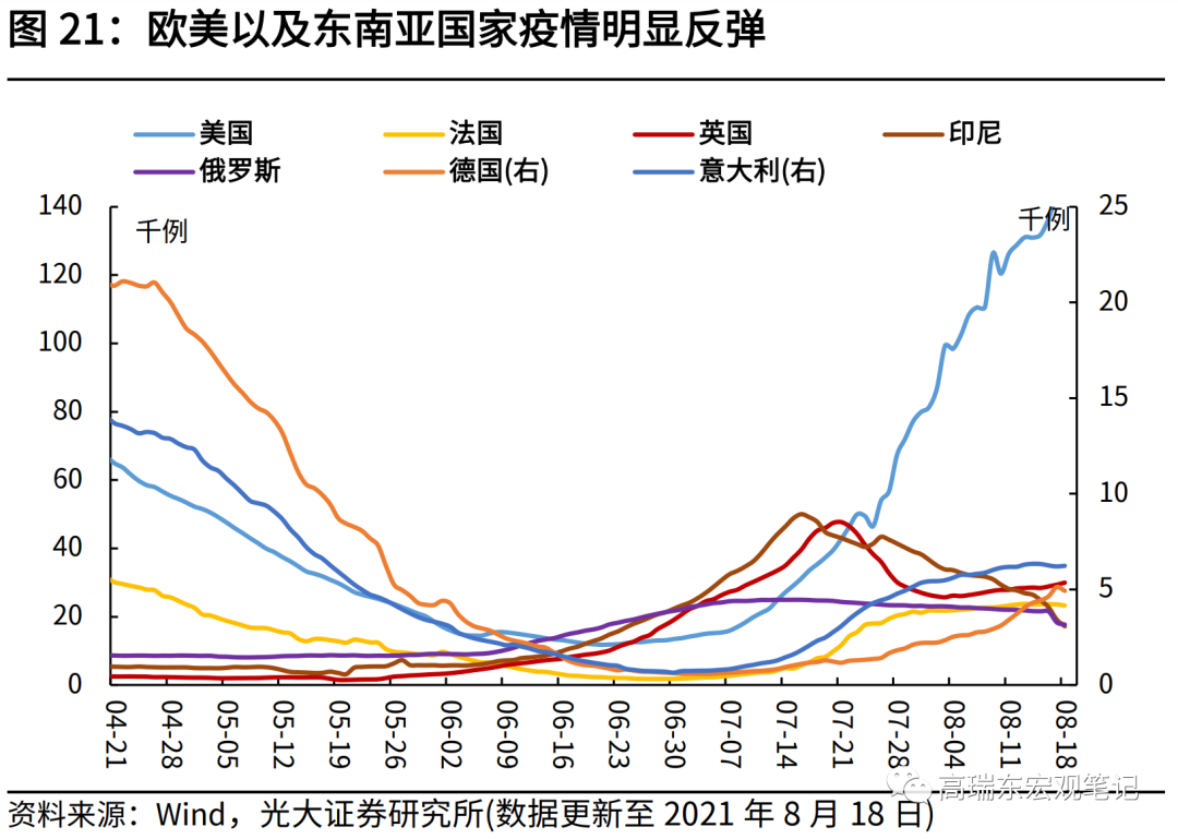 “德尔塔”毒株蔓延下,欧美以及东南亚国家疫情明显反弹。截至8月18日,英国单日新增病例(7DMA,下同)为29994例,法国新增病例也明显增加,单日新增病例分别为23279例;美国近期新增病例反弹较快,单日新增病例(7DMA)为144600例,而此前6月初单日新增已降至1万例左右;东南亚地区受疫情困扰较大,部分地区成为“重灾区”,印度尼西亚单日新增病例已反弹至22686例,泰国、马来西亚单日新增病例分别为20515例、22242例。