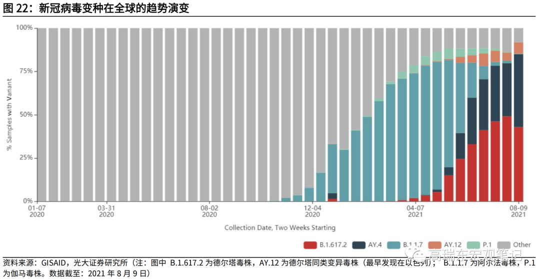 第三,新冠病毒易发生变异,现有疫苗对变异毒株保护性降低。新冠病毒是一种RNA病毒,容易发生变异。新冠病毒在全球已产生多类变异种,相比于原始毒株,变异毒株普遍具有更高的传染性。英国公共卫生部(PHE)研究显示,“德尔塔”变异株传播比原始毒株传播能力提高了100%,相比“阿尔法”变异株,“德尔塔”变异株传播率高出了60%,此外,“德尔塔”毒株潜伏期缩短,病毒载量更高,并且存在一定比例的免疫逃离现象,现有疫苗对其保护性大幅下降,从而使得疫情防控形势更加复杂。
