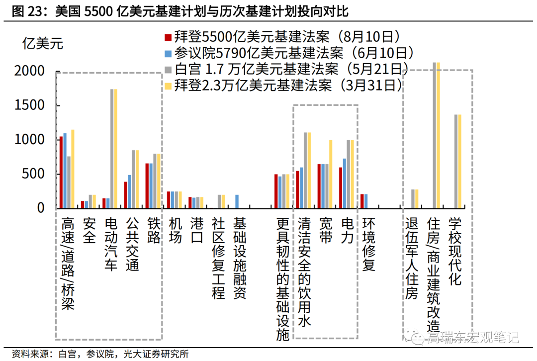 首先,拜登率先通过缩水版的基建法案,借助常规立法程序推进,已在参议院大比例投票通过, 并递交至众议院等待审批。6月24日,拜登同意参议院提出的5500亿美元基建法案,借助共和党人对于道路建设的迫切需求,最终在8月10日,拜登获得了来自14个州19位共和党人的支持。缩水版的基建法案聚焦于传统基础设施,包括交通、水电网等。相较于最初的2.3万亿美元基建法案,当前版本删去了护理服务、制造业投资、住房医院升级,压缩绝大部分绿色基建以及部分传统基础设施投资。