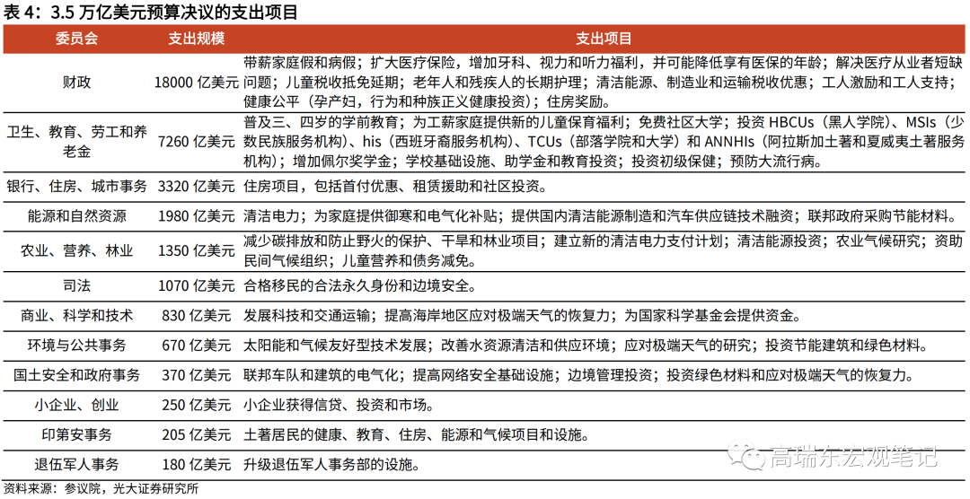 随后,参议院批准3.5万亿美元预算决议,囊括《美国家庭计划》及《美国就业计划》中多数被删减内容,并计划调用预算和解程序加快推进。7月14日,民主党提出一份包含和解指令的3.5万亿美元预算决议,将于10年内支出,涉及家庭、气候、医疗保健、基础设施和就业支出。8月10日,参议院以50:49的微弱优势批准该计划,后续将交由众议院审议,并启动和解程序。本次预算决议中,覆盖《美国家庭计划》,以及《美国就业计划》中被削减的部分(制造业投资、护理服务、住房投资以及清洁能源建设),此外还增加了医疗保险支出。(详见8月12日报告《5500亿及3.5万亿拜登刺激法案,将提升美国增长预期》)