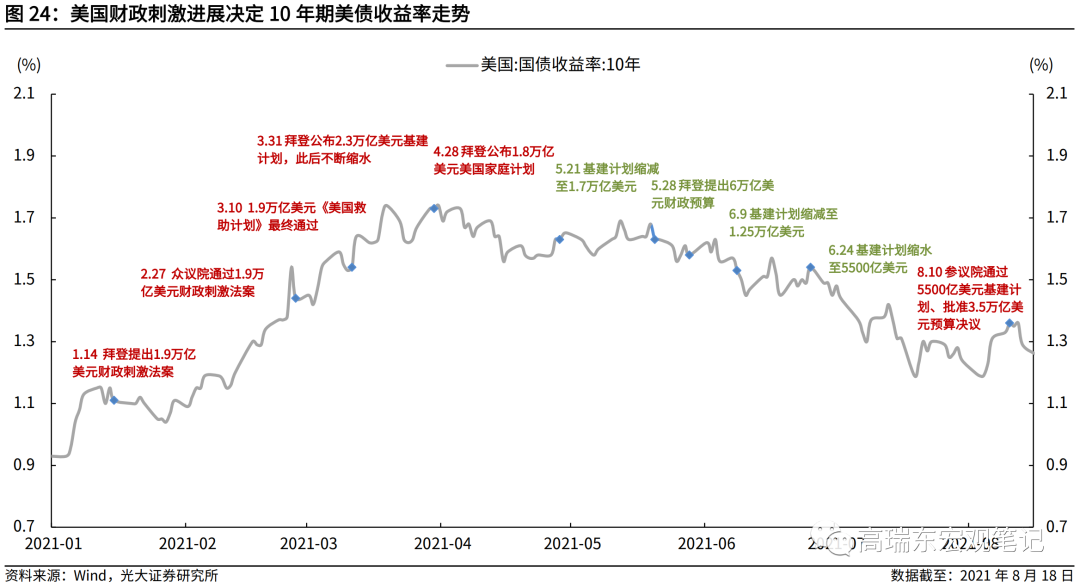 随着拜登及民主党围绕着3.5万亿美元财政刺激的持续推进,将提振市场对美国经济增长信心,带动美债收益率上行。前期由于拜登持续削减基建法案规模,市场对于美国强财政刺激的预期已经快速降低。回顾今年以来10年期美债收益率表现,随着1月份1.9万亿财政刺激法案的提出,10年期美债收益率开始快速上行,并且在3月底拜登宣布2.3万亿美元《美国就业计划》、以及4月底宣布1.8万亿美元《美国家庭计划》时,达到较高水平。但是,之后随着拜登持续削减基建法案的规模,10年期美债收益率也在持续走低。而近期随着拜登财政刺激的超预期推进, 10年期美债收益率一路下行的趋势也得到扭转。