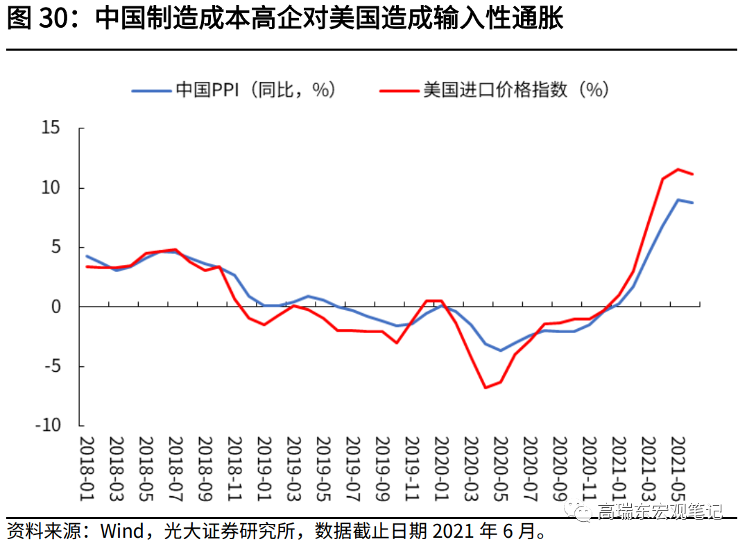 二则,美国进口成本大幅上涨加重企业成本压力,对通胀形成支撑。历史数据显示,中国PPI同比与美国进口价格指数有较强关联性。中国PPI自去年5月起就一路上扬,直到今年6月达8.8%,同时间段,美国进口价格指数自4月触底反弹,今年6月为11.2%。这显示,中国对美国有输入性通胀,在中国制造成本企稳之前,或将持续带动美国进口价格上行。