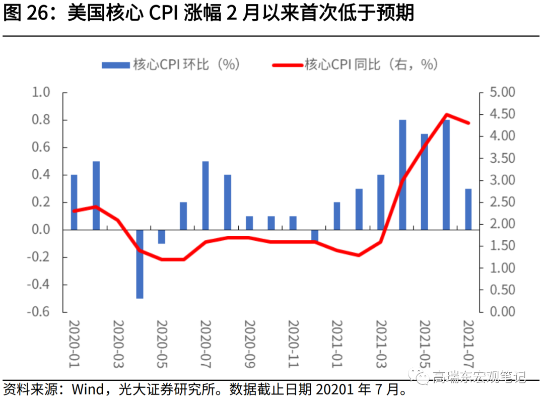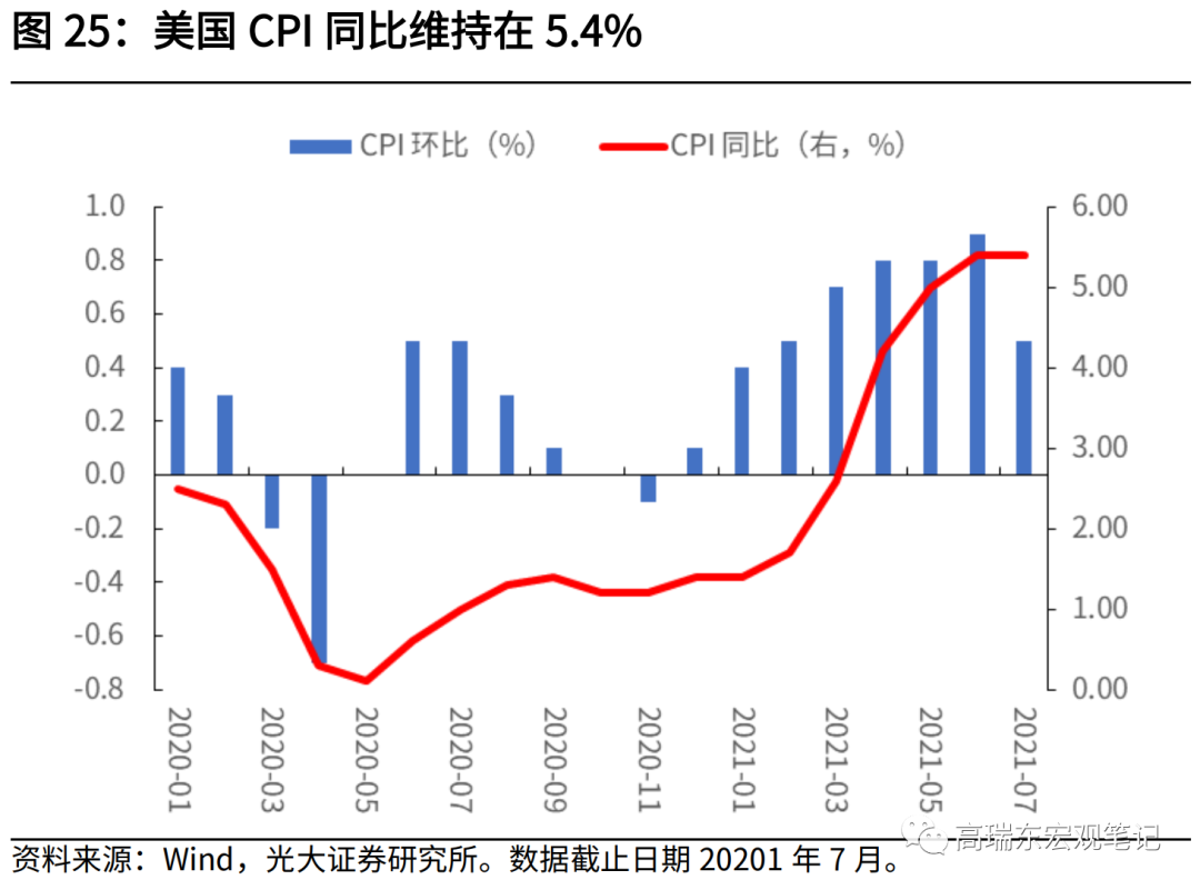美国7月CPI数据显示通胀压力持续升温。随着疫情对经济的约束逐渐打开,来自供给、需求、和劳动力三方面的压力使得通胀在年内都会保持高位。预计CPI同比高位运行和CPI环比边际下行的态势仍将延续。7月CPI同比虽略超出预期,核心CPI环比低于预期,暂时减缓市场对通胀持续上行的担忧。预计美联储将在9月的议息会议上重新上调通胀预期。(详见8月13日的报告《通胀挑战延续,7月美国CPI同比再超预期》)