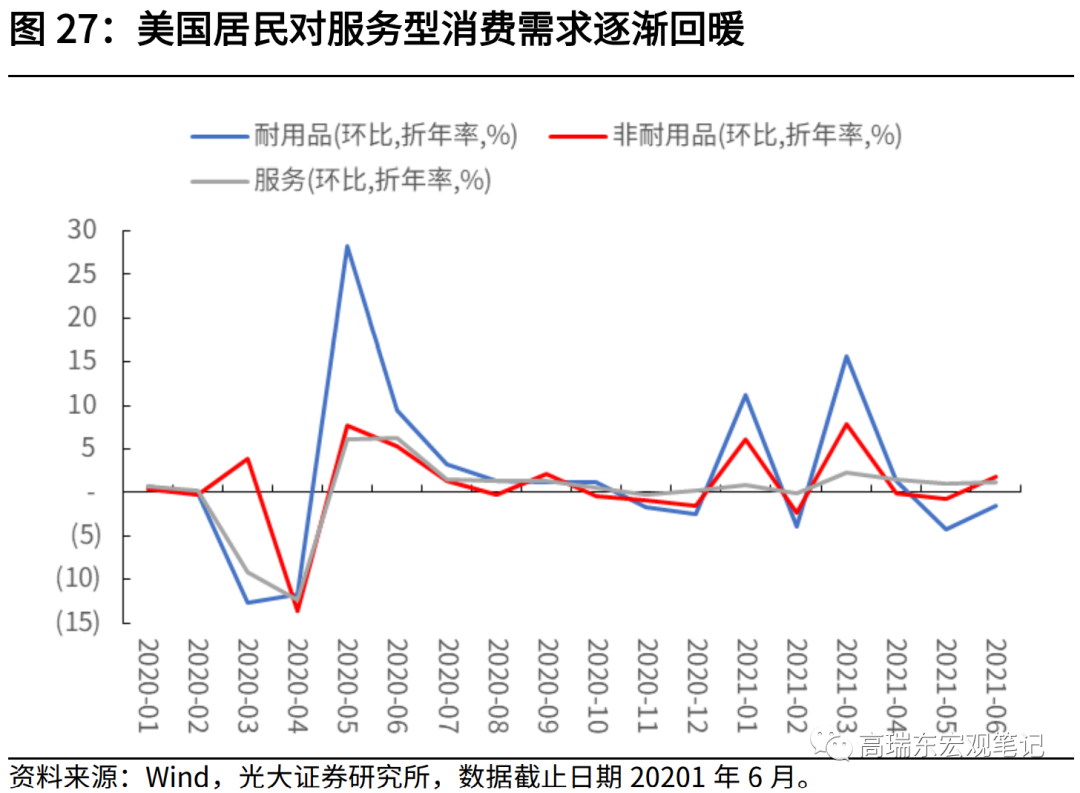 一则,6月PCE数据显示, 消费者对服务型消费近4个月稳步上升, 相较之下, 消费者对商品型消费有逐月下滑的态势。我们认为,下半年,经济恢复的动能将主要由服务性行业的消费所带动。