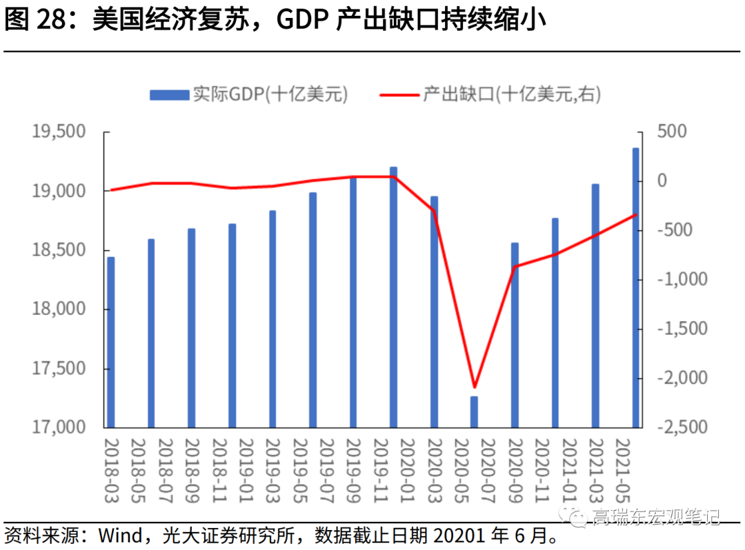 第一,在美国经济持续复苏和疫苗接种率不断上升的背景下,产出缺口已经逐步减小,经济解封使得人们对出行需求日渐抬升,消费者需求旺盛给通胀带来上行压力。