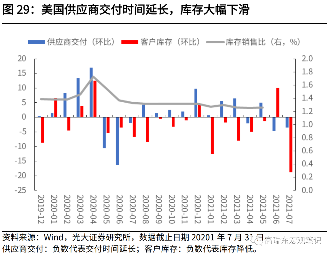 一则,7月ISM供应商交付指数和客户库存指数分别大幅下跌3.5和18.8至72.5和25。大多数受访企业表示,由于原材料和劳动力短缺的问题,企业的采购交付时间被迫延长。库存水平也因供应链阻塞而大幅下滑, 直接导致下游需求不能及时被满足,加剧供需缺口。7月29日发布的美国二季度GDP数据也显示,经济总体库存水平持续大幅下行,私人存货变化从2021年1季度的-880亿美元降至2季度的-1660亿美元,拉低2季度环比GDP1.1个百分点。
