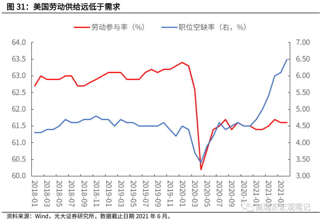 一方面,美国劳动参与率在大流行病爆发之后急剧下滑,截至7月份为61.6%,远低于疫情前(2020年2月)的63.1%。表明居民重回劳动力市场的意愿比较疲弱。另外,美联储7月货币政策报告提到,因对疫情和健康状况的担忧,去年和今年退休人口飙升,表示这部分劳动力供给或将永久性遗失。